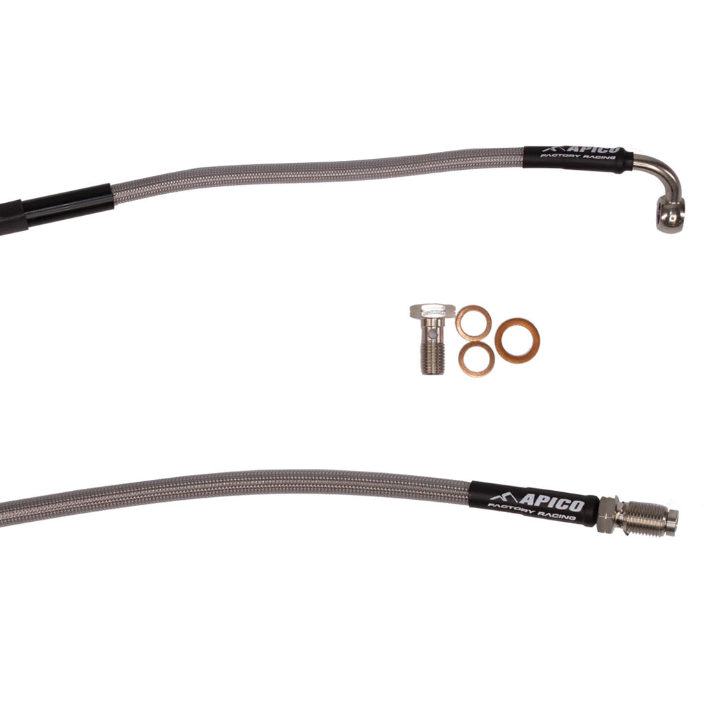 Apico Brake and Clutch Hose's are manufactured using only the very best quality braided material and are coated in durable plastic coating to add protection from roost, mud, sand, stones and water, Each Apico hose comes supplied with stainless steel banjo bolts and fittings.